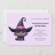 Um convite de aniversário com uma ilustração divertida do Dia das Bruxas para amantes de gatos. Um gato preto de olhos grandes vestindo um chapéu de bruxa preta grande com um cinturão roxo rosa ao redor da borda.