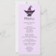 Menu de eventos com uma ilustração temática divertida do Dia das Bruxas para amantes de gatos. Um gato preto de olhos grandes vestindo um chapéu de bruxa preta grande com um cinturão roxo rosa ao redor da borda.