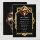 Um quadro de estilo deco de arte dourada falsa ornamentado tem uma incrustação preta na qual aparecem modelos brancos para a sua redação personalizada e uma moça Flapper elegante e curvilínea na frente. O design é adequado para as festas temáticas de 1920; as festas de arte deco tematizadas ou os eventos Gatsby do Excelente. São perfeitos para uso profissional e pessoal. O verso tem uma foto do aniversariante ou menina que pode ser apagada para revelar um fundo preto.