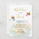 Um buquê floral com abelhas e pacificadores cor-de-rosa e azul no convite personalizado. Aquecedores de carregando de abelhas em um fundo floral. Altere facilmente as informações para o seu próprio design personalizado.
