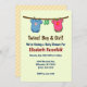 Ter uma chá de fraldas para gêmeos. Garoto e garota. Roupas na linha e fundo amarelo para este cartão de convite. Substitua as informações por suas. A parte traseira desta placa plana tem faixas amareladas diagonais em um design retrovisor de tendência.