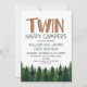 Um convite para primeiro aniversario de árvores verdes, gêmeas, bonitas e únicas, acampar.