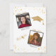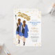 Gêmeos convidam Festa de formatura dupla. Gêmeas do sexo feminino, comemoração combinada da festa de formatura. Retrato de mulheres gêmeas com cabelo vermelho claro em vestidos pretos com túnica de graduação azul e bonés de formatura com balões de ouro para a classe de 2025. Posicione ambos os gêmeos na parte de trás do cartão com suas fotos, nomes, escolas e diplomas.