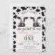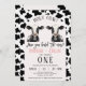 Gêmeos Impressão de Vaca Negra Arch Santa primeiro aniversario de Vaca Convite para o tema Vaca doce Primeiro convite de aniversário para gêmeos raparigas que apresentam um padrão de rosa claro e de impressão de vaca negra, vacas negras e brancas e sinos de vaca. Este convite de aniversário de uma vaca sagrada é ideal para alguém que procura um design de convite de aniversário de vacas negras e brancas para raparigas gêmeas.