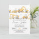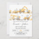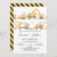Gêmeos param o trânsito em construção Concurso primeiro aniversario Concurso de construção O convite de aniversário do gêmeo gêmeo, temático, com vários caminhões e veículos de construção em duas filas no topo do design.