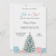 "Gender reveal invitation with a festive theme. It features a decorated Christmas tree, blue and pink gifts, and elegant text on a marble background."