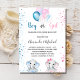 Para uma festa reveladora de gênero, chá de fraldas. Um fundo branco chic. Decorados com balões claros e azuis, cor-de-rosa e branco e poeira brilhante. Um elefante bebê e um elefante da gaby. Personalize e adicione o nome da mãe a ser e os detalhes da festa. O nome e o texto: Boy ou Girl são escritos com um estilo escrito à mão