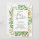 Este moderno convite para o chá de aspersão de bebês tropicais apresenta palma verde e dourada, filodendron e folhas de sprinkle. Um quadro de ouro elegante destaca o texto verde escuro. Dourados espalhadores acentuam esse exótico design botânico e trazem um pouco de sofisticado capricho ao convite. A parte de trás apresenta um poema doce para que os participantes saibam o que é um bebê borrifador. Este convite para a oasis da selva é perfeito para qualquer borda, praia ou borboleta de bebês tropicais.