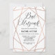 Estes convites de na moda Bat Mitzvah apresentam um padrão geométrico de aparência rosa dourado falso em um fundo branco, com a tipografia negra moderna.