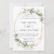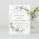 Este convite de casamento cômico apresenta uma imagem geométrica brilhante dourada adornada por belos arranjos de folhagem verde-aquática. Personalize-o com seus detalhes de forma fácil e rápida, basta pressionar o botão personalizar para reorganizar e formatar o estilo e a colocação do texto. c) O Feliz Cat Studio