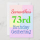 Este simples design de convite de aniversário apresenta uma mensagem como "Samantha's 73rd Birthday Gathering", onde o nome e o número de aniversário podem ser personalizados. Ele também apresenta uma divertida formação geométrica. Os detalhes do evento no verso podem ser personalizados. Poderia ser usado para convidar pessoas para a comemoração ou festa de aniversário de setenta e três anos de alguém. [~Z0000311]