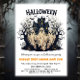Este convite para a festa do Halloween apresenta uma cena deliciosamente estranha com três figuras fantasmagóricas a derivar no primeiro plano, colocadas num pano de fundo de uma casa assombrada, árvores torcidas e sem folhas e morcegos a ferver. Jack-o-lanternas brilham do chão, adicionando pop de laranja à paleta sombria de negros, brancos e cinzentos. A design geral estabelece um equilíbrio lúdico entre assustador e divertido, com tipografia ousada e sotaques fantasma que sugerem uma celebração animada e amigável. O layout é claro e festivo, perfeito para atrair hóspedes no espírito da estação.