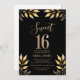 Set the stage for a night of pure stardom with the Gilded Glitz Sweet 16 Invitation, a premier choice for the young woman who deserves the spotlight. This card features an elite, high-contrast aesthetic with shimmering gold-glitter typography and radiant golden leaves set against a deep obsidian background. The design centers on a bold, sparkling "16" that immediately establishes a sense of prestige, while the sophisticated serif lettering for event details ensures a polished, professional finish. By choosing this high-impact invitation, you are promising guests an evening of absolute luxury and executive-level style, making it the ultimate strategic accessory for a landmark celebration.