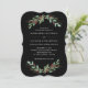 Este maravilhoso convite para o casamento de feriado apresenta buquês botânicos elegantes com folhas de ouro falsas, verde de Natal e groselhas vermelhas num fundo negro moderno. Perfeito para o seu casamento no inverno elegante.