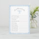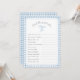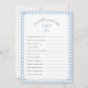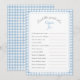 Perguntas editáveis sobre o título do jogo e texto para o chá de fraldas ou chá de panela. Apresenta um arco pintado manualmente com xadrez de gingham leve Blue frame snd backer.