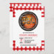 Um legal churrasco de jardim do verão, 4 de julho, comemoração da festa com ilustração de um churrasco de grelhador, padrão de gingham de xadrez vermelha, com churrasco gravado em carbono queimando na grelha