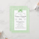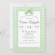 Gingham primavera verde-claro com design de arco. Personalize este convite de chá de fraldas neutro entre rapazes/raparigas e homens com os seus próprios nomes, endereço, data e registro.