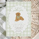 Celebre o seu primeiro aniversário com este charmoso convite de "Um Ouro Ano" com um adorável filhote de ouro a vestir um arco de gingham verde. O fundo mostra uma doce borda verde-clara de gingham com um quadro branco redimensionado, perfeito para a primeira festa de aniversário de um menino. Totalmente personalizável com o nome do seu filho, os detalhes da festa e as informações de RSVP.