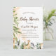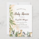 Chamadas de chá de bebê de aquarelas bonitas com uma girafa adorável, zebra e folhas de árvores. Esses convites para chuveiros de bebês elefantes são facilmente personalizados para seu evento simplesmente adicionando seus detalhes de evento.