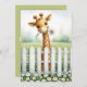Uma girafa divertida espreitando sobre uma cerca branca de piquete com uma margarida na boca. Todo o texto pode ser alterado.