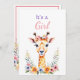 Uma doce girafa bebê cercada por flores rosas e roxas ilustração aquática convites para o chá de bebê de menina.