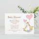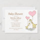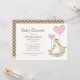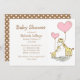 Convite para na moda chá de fraldas feito em branco, com trabalho de arte de mamma e girafas bebê segurando balões de coração cor-de-rosa. O verso do convite é feito em castanho com bolinhas brancas. Personalize todo o texto personalizado para atender às suas necessidades de evento.
