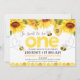 Girassóis Bees Copas Primeiro Aniversário Primeiro Convite Aniversário Abelhas doces e girassóis temem o primeiro convite de aniversário da menina apresentando um arranjo floral de girassóis, palavra de aquarela amarela e abelhas. A design também apresenta uma colmeia, um padrão de pente de mel e linhas de trajeto de mosca em forma cardíaca.