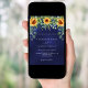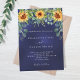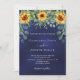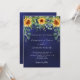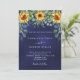 Um fundo azul marinho decorado com girassóis e folhagem de eucalipto. A cor azul é irregular. Personalize e adicione seus nomes e detalhes da festa.