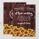 Adicione um toque de charme de vintage ao seu convite para o casamento com este design, que apresenta o serviço de casamento e a festa de casamento com uma medalha de flores vívidas, mini girassóis de dois tons, colocada em uma cerca de tempo. Personalize com as iniciais do casal, os nomes, a data do casamento e os detalhes do local. Adicione mensagens conforme desejado. Perfeito para temas de casamento no outono e no rusticário! Design © W.H. Sim. Mais informações em zazzle.com/expressionsoccasions