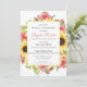 Os girassóis e rosas vermelhas cheios de alegria e amarelo brilhante enquadram este convite de chá de panela com sotaques dourados.