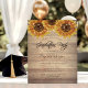 Girassóis rústicos e luzes de corda em fundo de textura de madeira.
