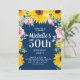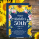 Girassóis amarelos de cor brilhante e rosas cor-de-rosa no convite de aniversário 50º de mulheres azuis marinhos. O texto é personalizável para qualquer idade. Seria bom para um piquenique de aniversário ou uma festa no quintal. Entre em contato comigo se puder ajudá-lo com a personalização ou se você quiser solicitar produtos adicionais de correspondência ou coordenação.