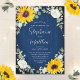 Estes convites de casamento rústicos de aquarela apresentam um design de girassol de aquarela com rosas brancas, flores do hálito do bebê, folhas de eucalipto e lanternas de corda sobre um fundo de madeira de marinho. Personalize-os com o seu texto. Produtos correspondentes disponíveis.