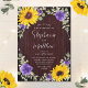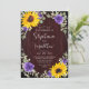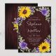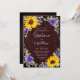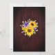 Estes convites de casamento rústicos de aquarela apresentam um design de girassol de aquarela com rosas roxos, folhas de eucalipto e luzes de cordas sobre fundo de madeira. Personalize-os com o seu texto. Produtos correspondentes disponíveis.