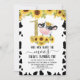 Girassóis Impressão de Vaca Dourada Glitter Um primeiro aniversario Convite Uma vaca Fita temida ou você ouviu o primeiro convite de aniversário de uma menina com um grande número de dourado, uma vaca fofa e vários arranjos de girassol. Este convite é uma maneira fofa de convidar convidados para a primeira festa de aniversário de uma moça temática de vaca.