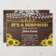 QUALQUER EVENTO. Todo texto sob o ouro "É uma surpresa" é editável. Convite de festas de girassol elegante e surpresa de ouro com design de corda leve sobre fundo de madeira rústica. Clássica, feminina e glamourosa. Perfeito para qualquer evento ou festa de aniversário em qualquer idade. Receba este belo convite agora!