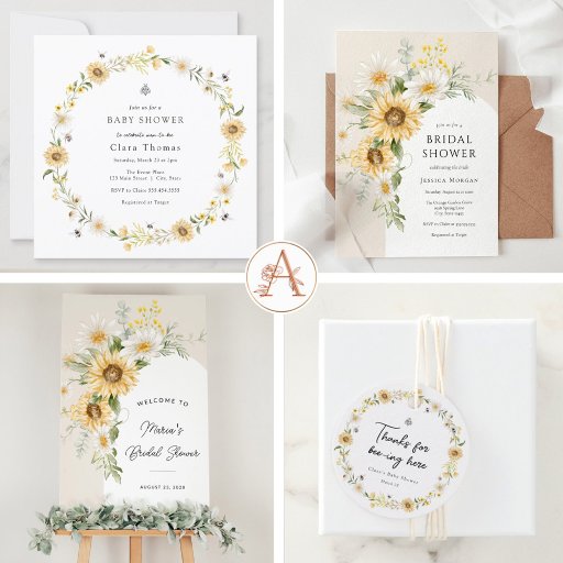 Chá de panela com um quadro arquitetado de girassóis e margaridas. Personalize com suas informações para que a noiva seja. Clique em "clicar para personalizar mais" para alterar o estilo, o tamanho ou a cor da fonte.