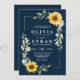 Convite para Casamento de Girassol e Marinho Azul GeométricoO desenho apresenta cor de água verde, girassóis,