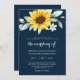 Convite para Casamento de Girassol e Marinho Azul GeométricoO desenho apresenta cor de água verde, girassóis,