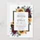Design apresenta elegantes rosas de aquarelas, peônias, flores silvestres e girassóis em vários tons de vermelho-burgundy, azul-marinho e mais sobre uma coroa de verde-eucalipto. Design também apresenta uma estrutura de madeira de celeiro debaixo da coroa. Um layout de fonte exclusivo complementa o design geral. Você pode alterar a cor de fundo na parte frontal e na parte traseira para a cor de sua escolha ou deixar ambas definidas como brancas. Veja a coleção nesta página para encontrar produtos de papelaria de casamento correspondentes.