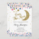 Sobre o Chá de fraldas da Lua, convite para gêmeos com lua, estrelas, e belos reluzentes dourados.