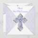 Lavanda roxo e prata Primeira Comunhão, convite com elegante cruz roxa e diamante prateado em um lindo fundo roxo lavanda e renda branca. Você pode personalizar facilmente este bonito convite da Primeira Comunhão roxo adicionando seus detalhes de evento no tamanho e cor da fonte e na redação de sua escolha. Você também pode alterar a cor de fundo.