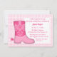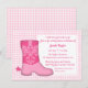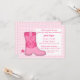 Sim! Este convite elegante, clássico e na moda está na paleta colorida feminina de excelente rosa para um tema de chá de fraldas Ocidental e Texas para mamães! Os principais elementos da design incluem uma bela bota de vaca com um motivo interessante e um padrão de gingham rosa para o fundo. Personalize com os detalhes do partido entre o espaço em branco disponível.