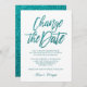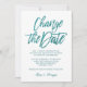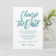 Adiamento de casamento elegante e elegante ou anúncio de mudança de data apresentando um roteiro de caligrafia de tendência que diz "Mude a data" em azul de turquesa de luxo sobre fundo branco para informar seu convidado sobre o adiamento ou cancelamento de seu casamento e novos planos. Para solicitação personalizada, escreva em citronelladesign@gmail.com