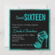 Doce dezesseis convite com salto alto de vidro em aqua falso glittery em um fundo preto com uma estrutura aqua parecendo divertida, mas elegante. Personalize este convite com seu nome e surpreenda seus amigos e sua família com este convite único e generoso. Deixe sua festa ser um sucesso a partir dos convites. Também existem selos de etiquetas de autocolantes disponíveis na nossa loja.