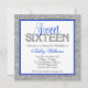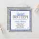 Um convite de aniversário moderno de dezesseis. Apresentando um falso design de brilho prateado com sotaques de azul real e preto. Designs são gráficos impressos em formato plano - NÃO É VERDADEIRO GLITTER.