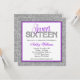 Um convite de aniversário moderno de dezesseis. Apresentando um falso design de brilho prateado com sotaques de roxo e preto. Designs são gráficos impressos em formato plano - NÃO É VERDADEIRO GLITTER.