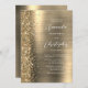 The left-hand edge of this elegant modern wedding invitation features a gold faux glitter border. The customizable text combines white handwriting, copperplate and italic fonts on a gold faux brushed metal background. The reverse side provides space for wedding details on a gold brushed metal background, along with a QR code guests can scan to visit your website and RSVP, which saves the cost of printing and mailing separate RSVP cards.