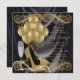 Convite de aniversário glamouroso de arte negra e dourada da mulher, com belos calçados de salto alto com brilho dourado, balões de ouro, champanhe e pérolas sobre um fundo glamouroso e luxuoso de satina negra. Este elegante convite de aniversário preto e dourado é facilmente personalizado para o seu evento simplesmente adicionando os seus detalhes no estilo de letra e cor, redação e layout da sua escolha. Você também pode mover ou apagar as espirais, champanhe e balões. Esta é uma design impressa sem joias reais, pérolas, brilho, etc.