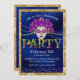 Este convite de festas personalizado apresenta um tema glamouroso do mascarada Mardi Gras. Uma máscara é fotografada no centro com miçangas roxas, douradas e Mardi Gras verdes penduradas em ambos os lados. Um quadro de sequência de ouro borda o convite e os diamantes dourados brilham como confete ao longo das partes superior e inferior.